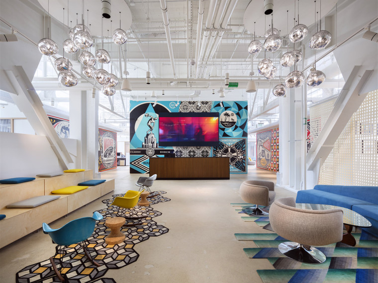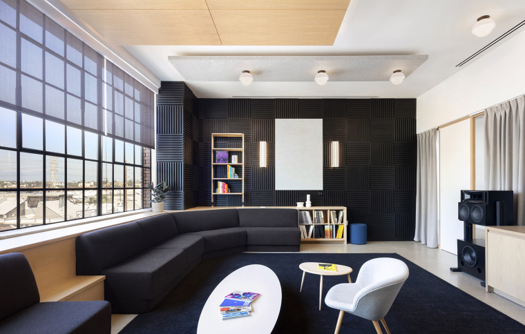 休閑區整體給人極簡的裝修風格,不類似于傳統的辦公室,采用靈活的辦公空間,漂白的橡木制品和帶有藍紫色調的中性面料與建筑原有的澆筑混凝土地面形成了如柔軟的對比,使得整個休閑區的裝修文藝范十足,黑色的經典色大幅進行鋪設,簡約中帶著高貴,給人藝術氣息十足。